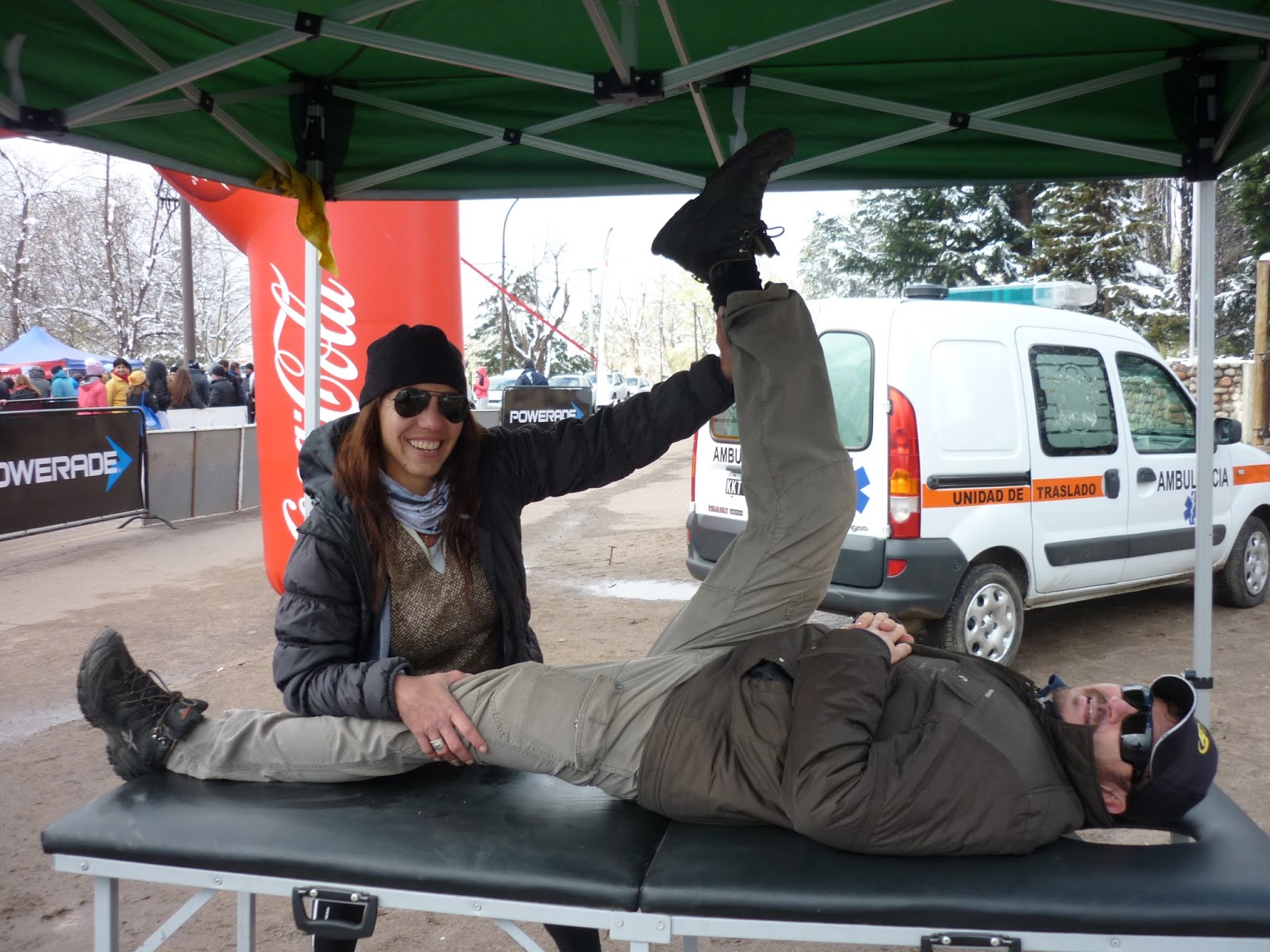 La masajista Eli Alaniz elongó a los atletas luego de la carrera. |