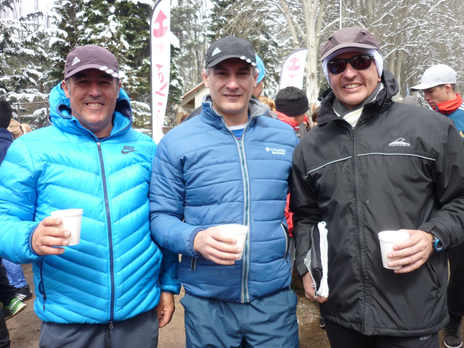 Fernando Cottichelli (primero de la derecha) junto a sus amigos corredores calentaron el cuerpo con el caldo que ofrecía la organización luego de la competencia. |