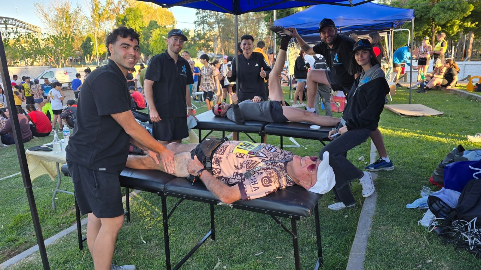 Recuperación. Los kinesiólogos del Instituto Rivadavia levantaron una carpa donde recibieron a los atletas para ayudarlos a recuperar sus piernas con reparadores masajes.