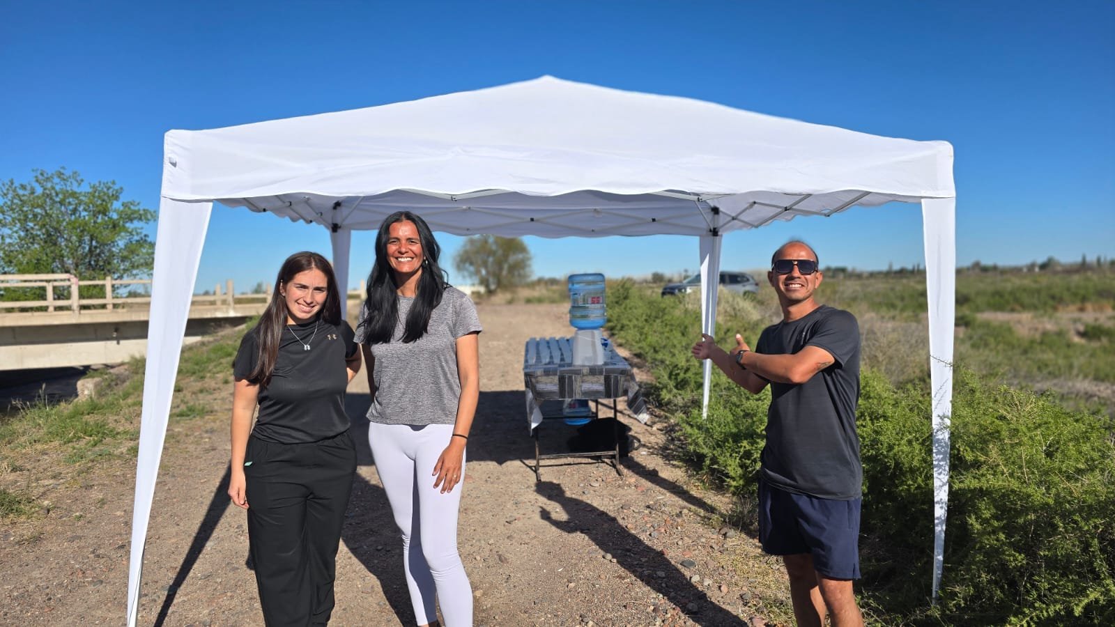 Buena onda. Agustina, Daniela y Mauricio fueron los responsables del primer puesto de hidratación de los 15 km.