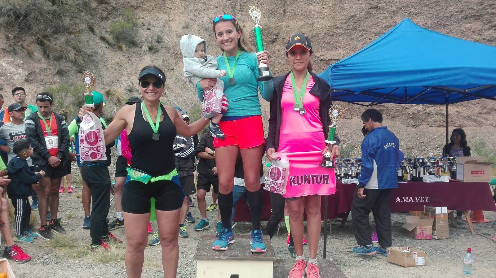 María Belén Cabrera junto a su bebé en el escalón más alto del podio de los 21K femeninos. Foto: Claudio Pereyra Moos.