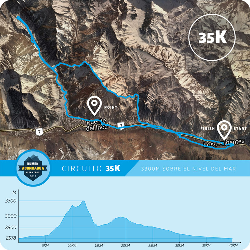 En cuanto al circuito de 35K, largará desde la playa de Penitentes, se dirigirá hacia el cerro Banderita Norte, para luego conectar con el cerro Manta y posteriormente descender por la Quebrada del Durazno. De ahí pasará por el primer campamento de asistencia total en Confluencia para luego volver a Horcones por la ruta tradicional. Una vez que los trail runners registren su salida del Parque Aconcagua se dirigirá a Puente del Inca y posteriormente a Penitentes para la culminación de la competencia.