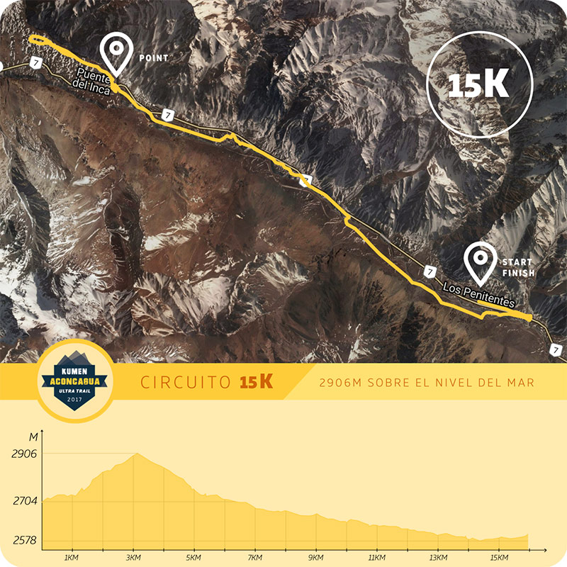 Por su parte, la distancia más corta, su circuito largará desde la playa de Penitentes, se dirigirá hacia Puente del Inca, todo por senderos aledaños a la ruta, para llegar al Mirador del Aconcagua (sin entrar al Parque) y volverá a Penitentes para que termine la prueba.