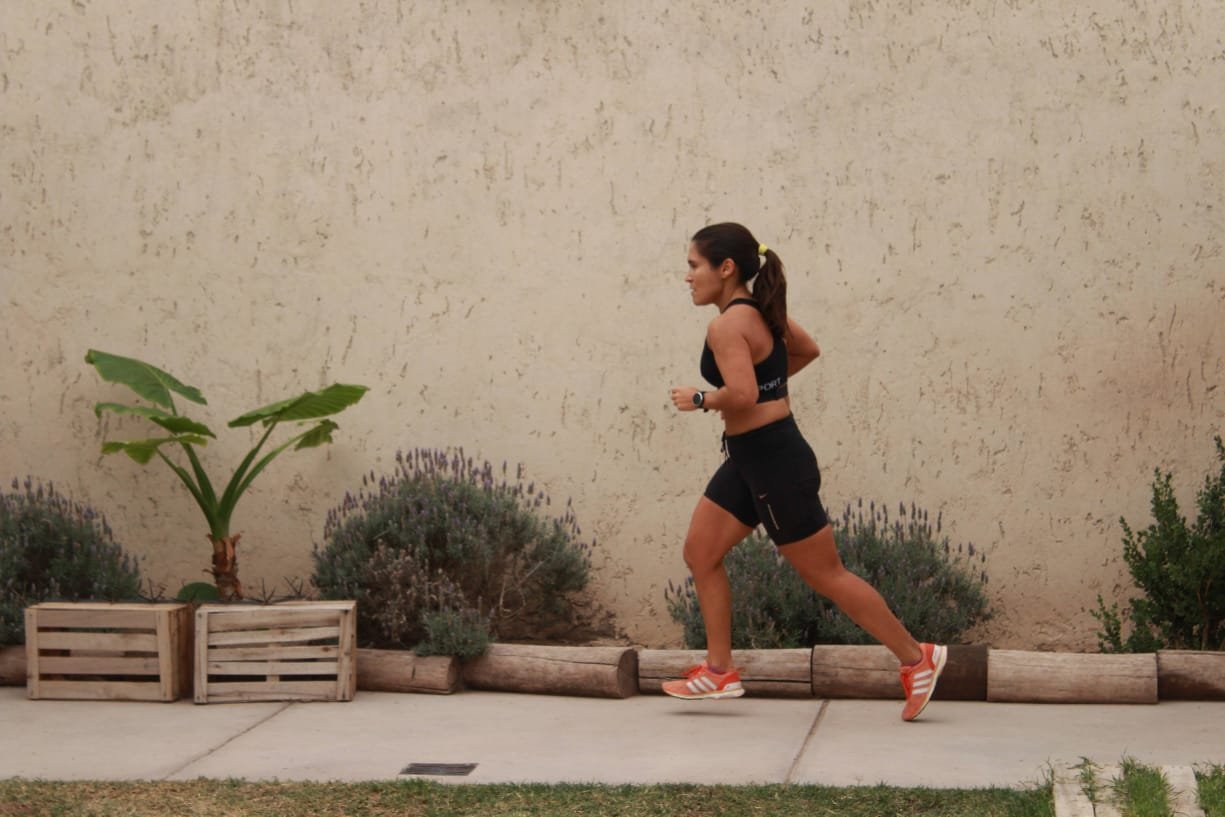 Con toda la energía. La mendocina María Eugenia Morales corrió en el patio de su casa poco más de 8K a un ritmo de 4 minutos 47 segundos cada mil metros ¡Muy bien!