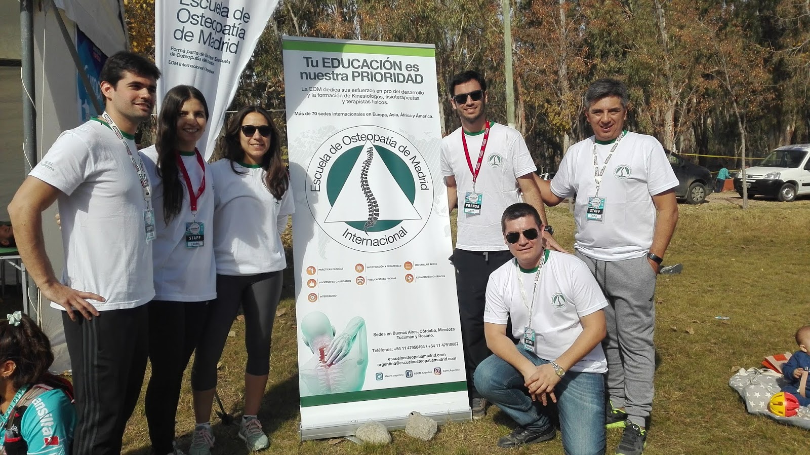 Por la salud del atleta. Los kinesiólogos de la «Escuela de Osteopatía de Madrid» ofrecieron en su stand reparadores masajes a los trail runners que traspasaban la meta. La osteopatía es un sistema de evaluación y tratamiento manual y natural que busca reestablecer la función de las estructuras y sistemas del cuerpo.