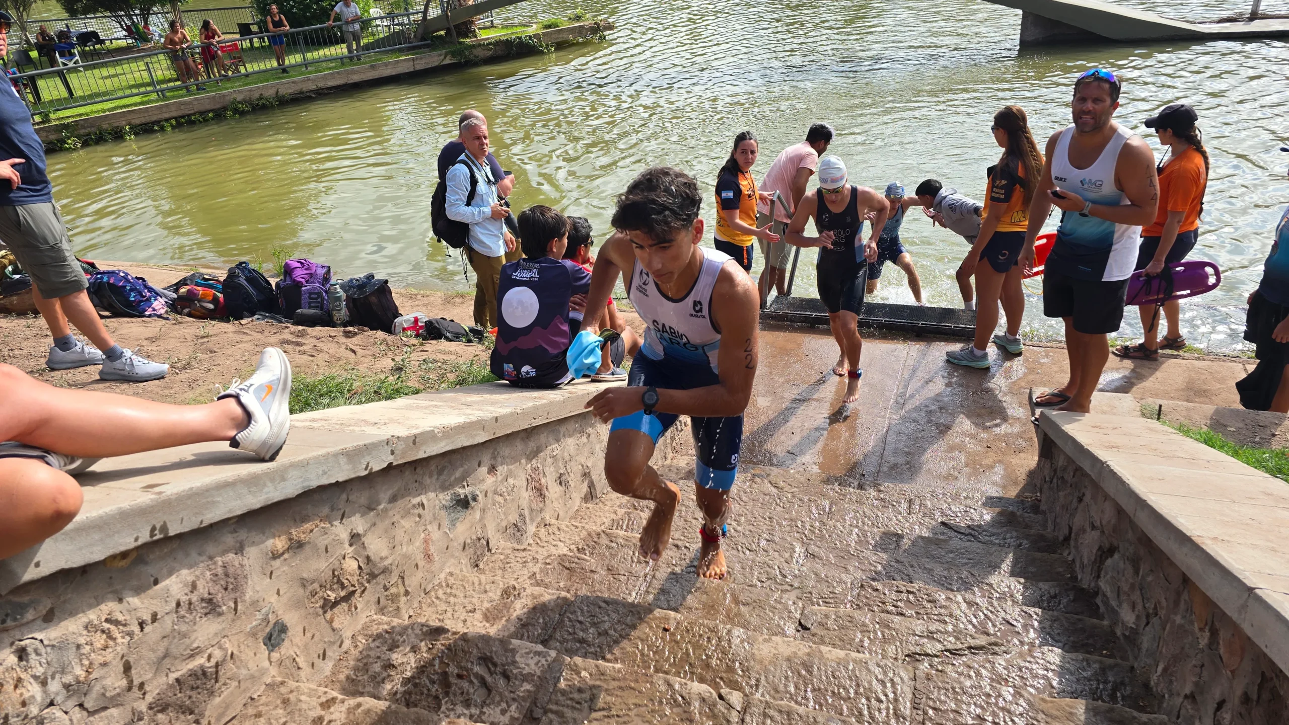 Faustino Sabio saliendo del lago del Parque San Martín en el Triatlón Vendimia 2026.