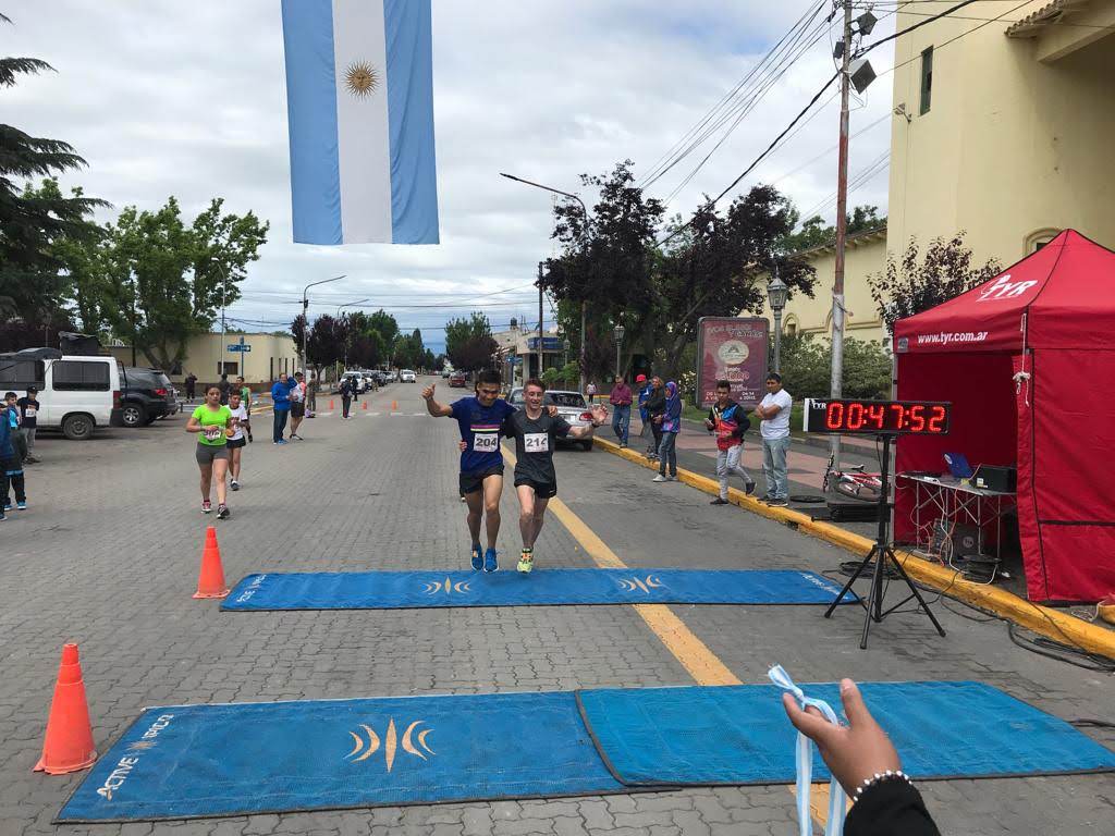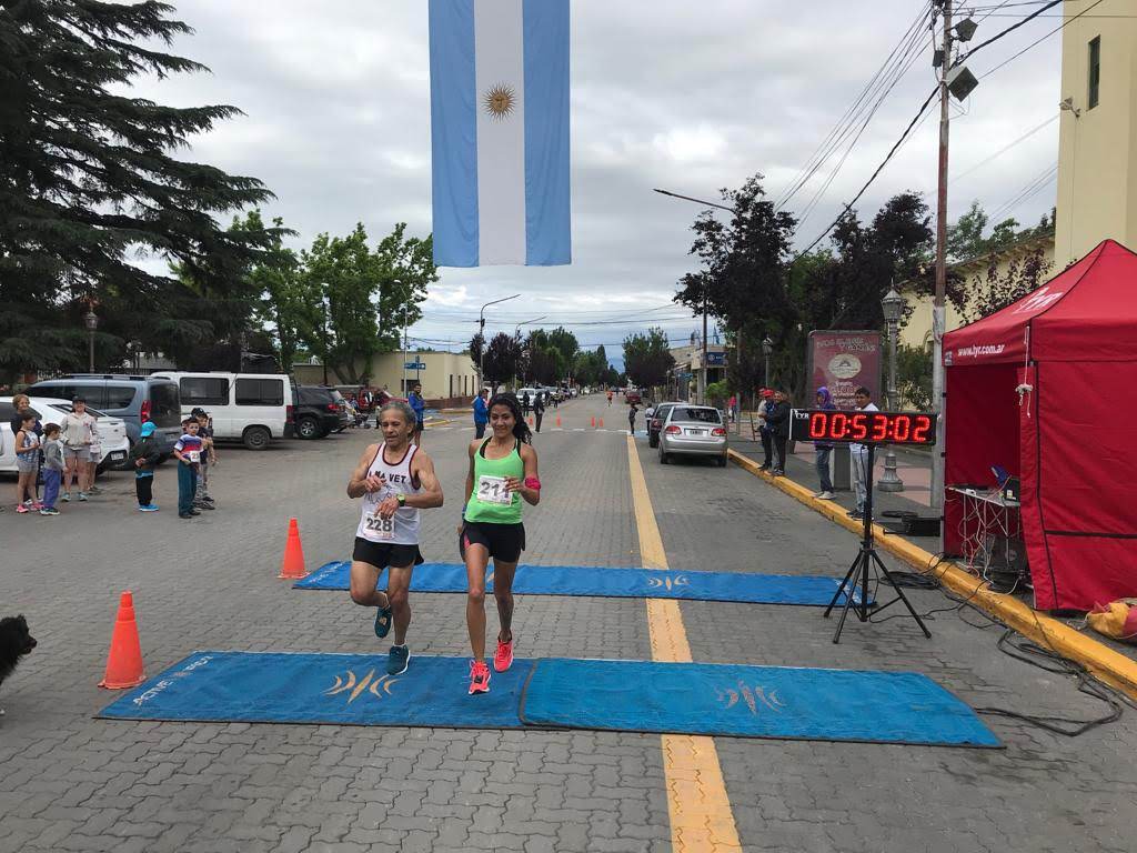 | Gabriela Bustos cruzó la línea de llegada junto a su compañero de A.Ma.Vet. Alberto Etepa. |