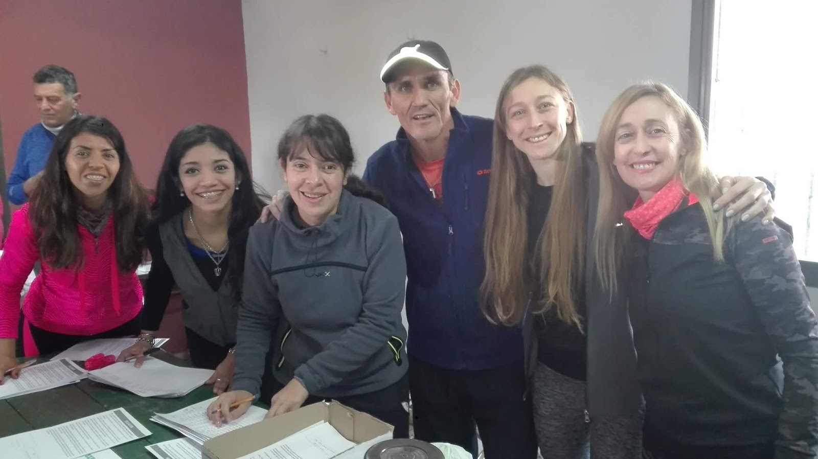 Javier González (al medio) con sus alumnas de AMEG en la mesa de las acreditaciones. Los rivadavienses rebozaron entusiasmo en la organización de la competencia. Foto: Claudio Pereyra Moos.