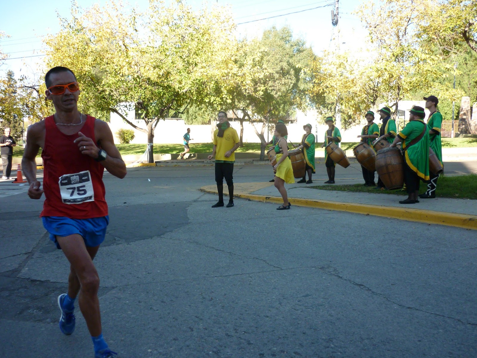 Comparsa para correr. Una muy linda idea de la organización fue que grupos de comparsas se distribuyeran a lo largo del circuito para alentar a los corredores. Así, 2K antes de la llegada, estaba la comparsa de candombe «La Pérgola». Este grupo muy buena onda funciona todos los domingos en la plaza del barrio COVIPA de Guaymallén desde las 18 horas. Da clases gratuitas ¡A bailar!