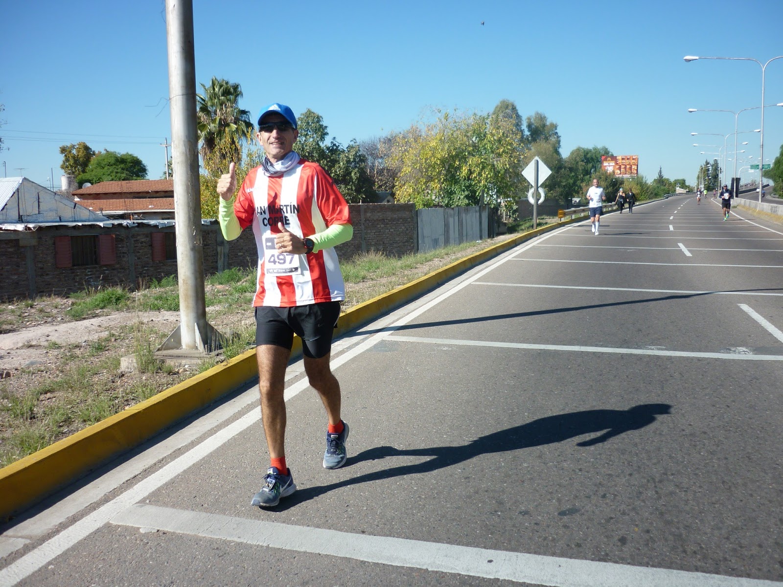 “Chacarero” runner. César Martín Lazarini es hincha de su amado San Martín y maratonista. Ayer corrió los 42K con la casaca de su club.