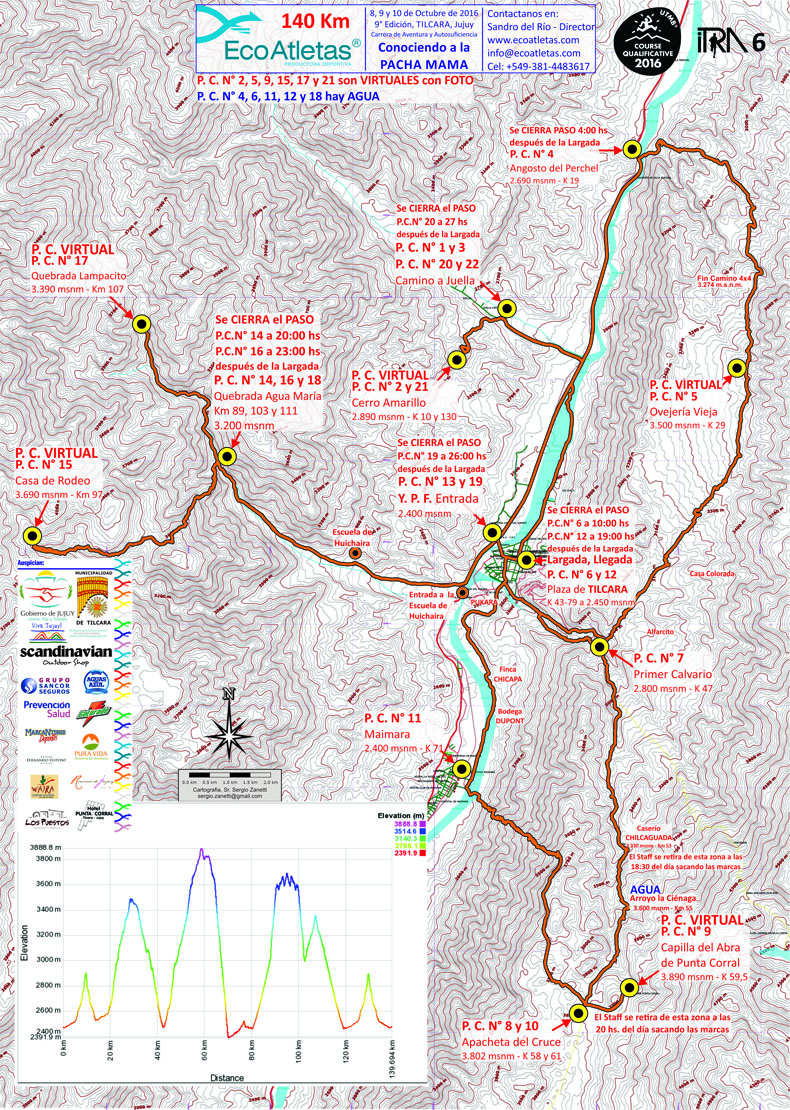 La base de la carrera fue la ciudad de Tilcara, según la ONU “patrimonio natural de la humanidad”, donde estuvieron la largada y la llegada de todas las distancias. En los recorridos más largos se pasó dos veces por allí: primero, se dio una vuelta de unos 43K, pasando por Ovejería Vieja, el tramo más exigente ya que allí es donde los efectos de la Puna se sienten más (misterio de la geografía de la zona). Luego se dio una vuelta de unos 37K, pasando por el punto más alto de la carrera, la Capilla del Abra de Punta del Corral.