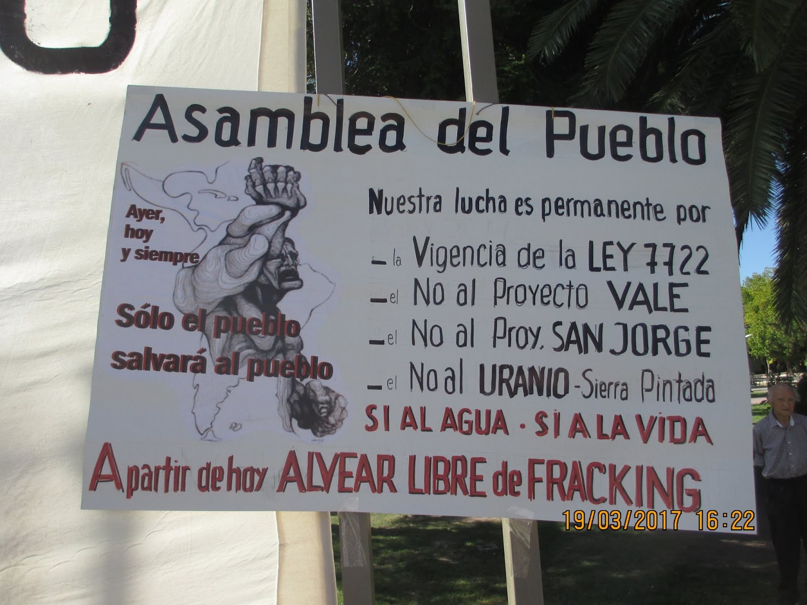 por la gran contaminación con sal pura, agotando el agua de los ríos y acuíferos del sur de Mendoza. No a Vale por el voluminoso consumo de gas y electricidad que implicará afectar gravemente la matriz energética nacional. No a Vale por la mentira de una gran ocupación de mano de obra: por cada persona en la minera Vale se ocuparían 40 veces más en la agroindustria mendocina para fabricar alimentos y no para destruir el medio ambiente.